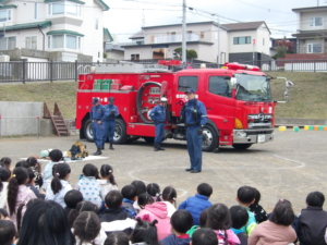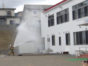 窓の外を見ると消防車が!消防車が幼稚園に入ってくるのをじっと見入る子どもたちでした。今日は防火避難訓練。火事のサイレンとともに園外へ歩いて避難した子どもたちは、先生の話を聞いて口を押さえ、姿勢低くして避難していました。消防士さんのお話を聞いたり、放水の様子を見せてもらってとても嬉しそうにしていましたよ。最後に消防車の前で記念撮影。消防士さんとハイタッチをしてもらいニコニコ笑顔の子どもたちでした。