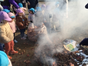 今日は楽しみにしてきた『焼き芋パーティー』。昨日はみんなでさつまいもをアルミホイルに包んで焼く準備を行い、今日は秋晴れの中の焼き芋を楽しみました。隣の公園で集めてきた木の葉を炉の中に投入すると、もくもくと白い煙があがり、勢いよく燃え上がっていくのを歓声をあげながら見ていた子どもたちです。焼き上がったお芋の甘さにうっとりとしながら、お友達や先生と「おいしいねぇ」と話しながら食べていました。おかわりもいっぱいして、大満足の子どもたちでしたよ。